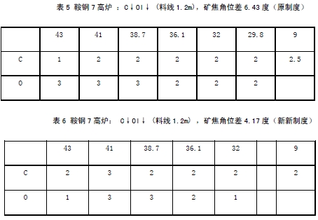 鞍钢7高炉在没有改变原制度的时期对炉温急返热的炉况适应能力较差,在炉温急返热时经常出现崩滑料现象,这将会对风口运行状况带来不利影响。因此鞍钢炼铁总厂组织人员到全国节能降耗等先进指标的高炉车间进行实地考察,学习了同行业先进技术。例如使用小粒度烧结矿压边缘气流和改变装料制度来调整煤气流分布,以便进一步完成节能降耗攻关计划。(见表 5、表 6)