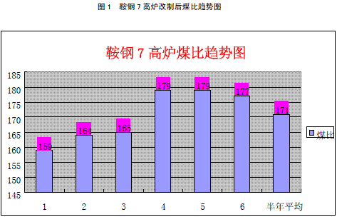在鞍钢 7 高炉风口下沉时,7高炉采取改变煤枪角度,由原来7°煤枪改为 9°煤枪。确 保在风口下沉时保证风口正常喷吹煤粉,减少7°煤枪对风口的磨损甚至因煤粉磨坏风口带来的风口烧穿等的恶性事故发生,与此同时保证了7高炉煤比达到160