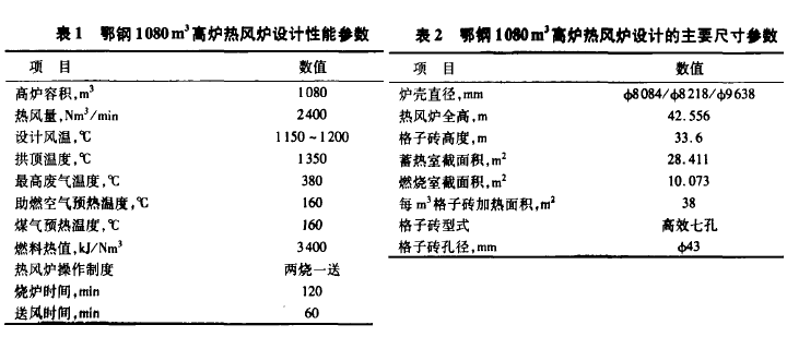 鄂钢1080扩高炉配备3座内燃式热风炉,能够满足2400 Nm3/min风量时1200℃的风温要求。热风炉性能参数见表1,热风炉主要尺寸参数见表2 热风炉工艺计算是以单烧高炉煤气为基础的。为了达到1 150-1200℃的送风温度,燃烧计算结果表明,助燃空气和高炉煤气的预热温度应达到160℃以上的水平,可通过优化蓄热室格子砖高度使废气温度控制在350℃的水平来实现。