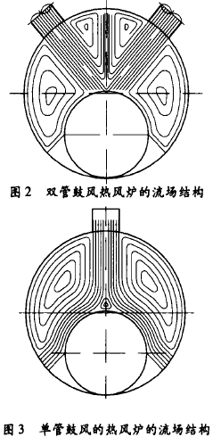 差异。目前国内外各种热风炉,其人炉冷风配气的均匀程度为45%-65%,尤其是对单管鼓风的内燃式热风炉,其冷风配气的均匀程度只有40%-50%,这是由于热风炉的固有结构造成的。在满砌格子砖的热风炉蓄热室内,众多让冷风和烟气通过的竖向格子砖孔,实际上是一簇并联的气孔通道。每一个竖向格孔对气流流过时的阻力,在正常情况下是一样的,因此流进每一格孔冷风或烟气流量则取决于流体的人口特性,如压力、流速、人口形式等。双管和单管鼓风的热风炉的流场结构见图2,3。