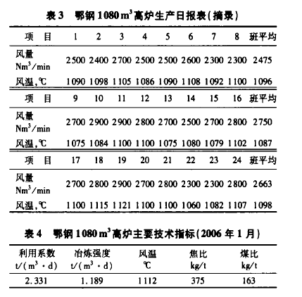 表3为高炉正常运行时2005年9月日报表摘录数据(混风阀开口度保持在15%左右)。表4为高炉的主要技术经济指标。从以上数据可以看出,在单炉送风的制度下,该热风炉具有稳定提供1 100℃风温的能力。根据鄂钢铁厂高炉生产报表记录,在2005年5月份,风温曾达到1 150℃时,因部分送风支管局部发红,故而未继续提高风温,根据高炉生产实际需要,现将热风温度控制在I 120℃以下。