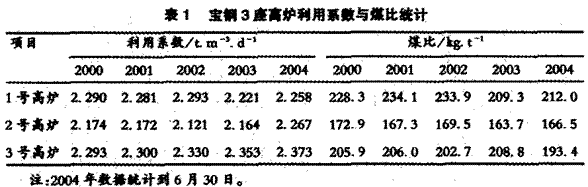 宝钢3座高炉多年来一直保持着强化冶炼进程,其高炉利用系数和煤比见表1。3号高炉1994年9月投产至今已接近10年炉龄,2004年2月高炉利用系数达到了2.5以上生产水平。今年成功地实施了S-3段冷却壁整体更换技术,正准备向更高利用系数挑战。宝钢高炉在强化冶炼初期也遇到了长寿方面的许多问题,担心难以持久,随着新技术不断应用,问题才逐步得到解决。