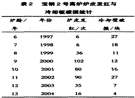 通过合理调整煤气流,结合炉身造壁和强化冷却等措施,炉身上部的炉皮发红次数和冷却设备的破损显著减少。以2号高炉为例:炉身残砖已很薄,但炉皮发红次数没有增多,见表2。因此,在炉缸活性指数和风口取样技术指导下,上部煤气流得到合理控制,解决了高炉上部遇到的长寿问题。