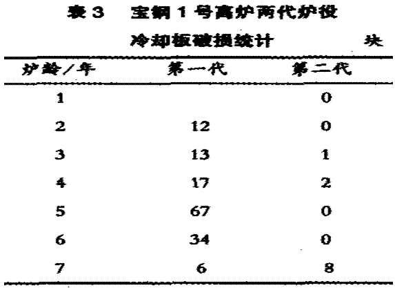 增加冷却水量,特别是强化炉身下部冷却,对于强化冶炼下的炉体长寿维护是有显著效果的。1号高炉第2代与第1代比较,冷却方式和布置完全一样,但前者冶炼强度大于后者,只因冷却水量前者是后者的二倍,结果冷却设备的破损量明显要少很多(见表3)。2004年由于局部边缘煤气流过强造成一次损坏冷却板8块,包括2003年1号高炉炉身部位出现的长寿问题也是局部边缘煤气流管道行程所致,煤气流分布对炉身中上部寿命的影响可见一斑。2号记炉2002年因炉缸侧壁温度异常上升限产而年产较2001年减少2.42%,2003年起在炉缸气隙指数的指导下,及时分清了炉缸温度上升的原因,采取相应的维护措施,近两年来没有加过钍矿和限过产量,一直保持高产,而炉缸没有出现新的侵蚀。这就说明延长炉缸寿命,实现20年以上寿命是可能的。这一成功经验应用到1号高炉后同样取得了很好的效果。这说明宝钢高炉长寿维护系统工程技术又越上了一个新台阶。