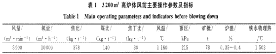 休风前炉况稳定顺行,生铁[Si]0.35%~0.4%,铁水温度1500℃左右,渣铁流动较好。休风前主要操作参数及指标列于表1。