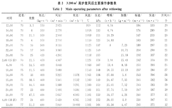 在渣铁流动性和高炉透气性好转的情况下,为了加速轻负荷料的下达和加热炉缸,16:00开始谨慎的开风口作业,同时有节奏的逐步加风,23:00风量加到4000m3/min,标准风速达到240m/s,基本恢复到正常生产时期的控制水平。此时复风轻负荷料基本下达风口,铁水温度已经上升到1450℃以上,渣铁排放非常流畅,随后决定加快了开风口速度,并按每开一个风口增加180m3/min风量的节奏加风。15日13:00风量达到5100m3/min,开始富氧。16日9:00风量5900m3/min,实现全风作业。12:40捅开第32个风口;至此高炉各项操作制度和操作参数已全部恢复到正常生产水平。复风后主要操作参数列于表2。