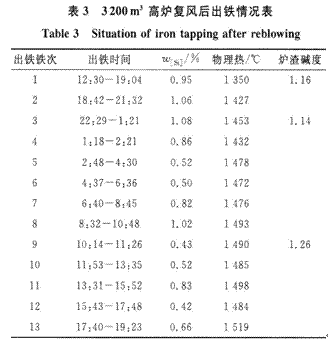 送风后集中加了2罐焦炭,总计45t。后续料焦比增加了172kg/t为550kg/t,为全焦冶炼水平。11:15全引煤气后开始喷煤补充热量,铁后焦比减至500kg/t(复风后20.5批料)。14批料后,减焦比至450kg/t。27批料后,减焦比至400kg/t。复风初期铁水热量低,流动性差,随轻负荷料下达,铁水物理热逐步上升,由于此次复风料没有采取集中大量加焦的模式,炉温控制的非常理想,在轻负荷料下达的前后,依据实际炉况和炉温发展趋势,通过提前增加加湿量和减少喷煤量的小幅度调整,稳定综合负荷,炉温没有出现大幅度反热和波动现象,生铁[Si]相对稳定,铁水物理热稳步提高,详见表3。随着后续焦炭负荷料逐步加重,再以其对应的缩减加湿和增加喷煤,保持理论燃烧温度和综合负荷稳定。复风40h以后,综合负荷已基本接近正常生产水平,炉况稳定、炉温正常,高炉已具备进一步降低焦比、增加喷煤的炉况基础条件。