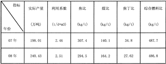 2007年1月4日开炉投产,高炉顺利开炉达产,4天即实现2.02的利用系数。开炉后第三个月就打出了300kg/t以下的焦比,在重负荷下长期保持顺稳至今。07年及08年生产经济技术指标如下: