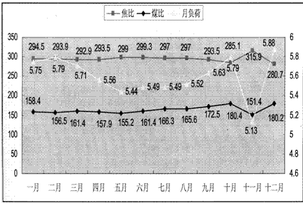 进入08年以后,焦比一直保持在300kg/t以下(不含11月中修),具体焦比、煤比、月负荷指标如下图: