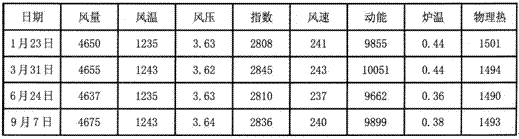 9月8日的16小时检修送风后2小时45分钟给煤,4小时35分钟加第一步负荷4.69-4.96,4小时达到全风,8小时40分钟用富氧,10小时恢复到检修前的负荷5.28,送风后第一次铁炉温0.37%,物理热1460℃。到9月12日负荷逐步加到了5.60。