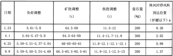 4月1日24小时检修退至最后一步负荷后附加焦是5批以后附加一批焦,隔5批再附加一批焦炭,隔5批再附加半批焦炭,隔5批再附加半批焦炭,共附加3批焦炭。其它3次检修都是退至最后一步负荷后附加焦是5批以后附加一批焦,隔5批再附加半批焦炭,隔5批再附加半批焦炭,共附加2批焦炭。控制合理的加停风料时间,确保风停下来后,轻料下达至炉缸上沿或炉腹位置。