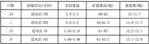 1月24日的12小时检修送风后1小时40分钟给煤,3小时50分钟加第一步负荷5.0-5.3,7小时达到全风,10小时30分钟用富氧,15小时恢复到检修前的负荷5.58,送风后第一次铁炉温0.54%,物理热1480℃。到1月26日负荷逐步加到了5.81。