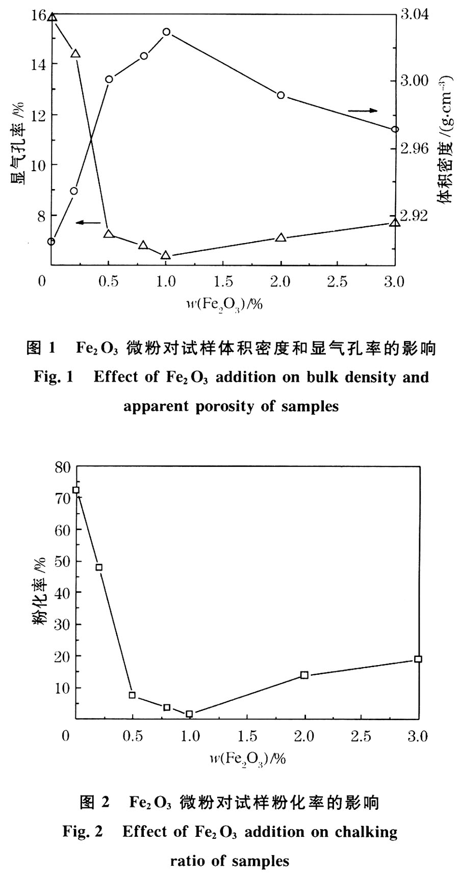 (1)当Fe2O3在0~3%时,随着Fe2O3的增加,体积密度先增加再减小,显气孔率则先减小后增加,两者均在Fe2O3为1%处出现极值。当Fe2O3在0.2%~0.5%的范围时,试样的显气孔率和体积密度变化最明显。