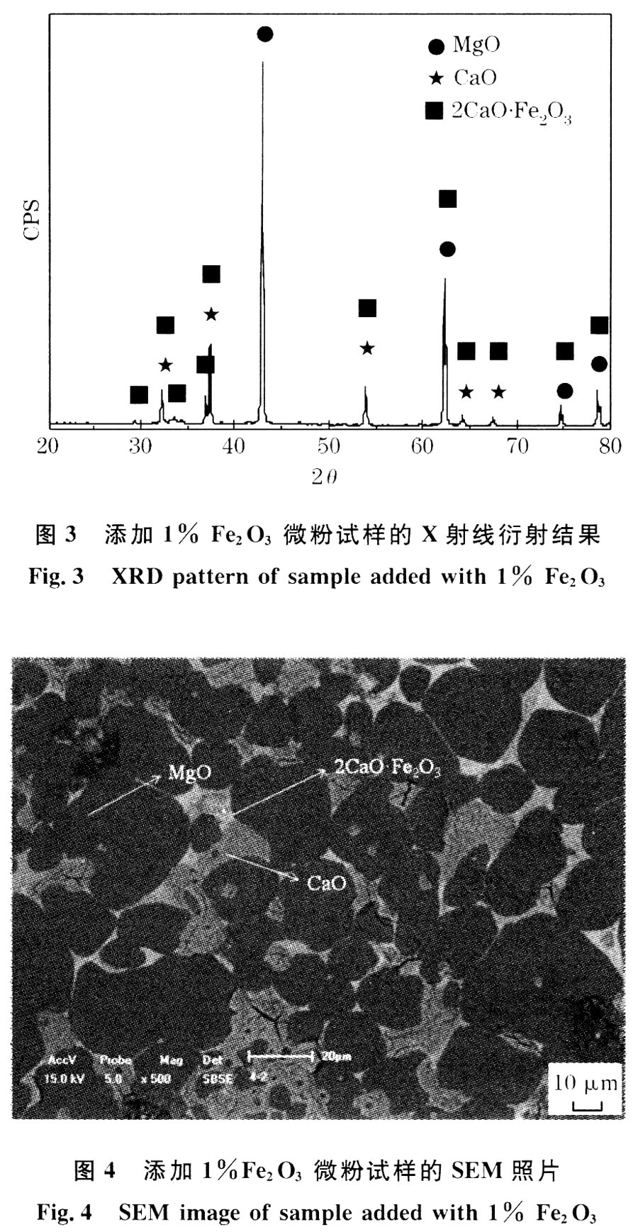 由图1和图2可知,通过添加Fe2O3微粉,可以明显提高MgO-CaO系耐火材料的烧结性能和抗水化性能。