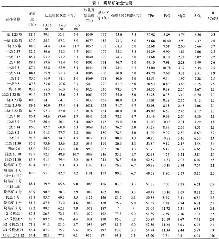 根据我们统计,一烧、二烧、四烧的烧结矿的冶金性能指标大体相当,所以用一烧的试样为基础进行分析。