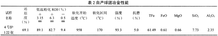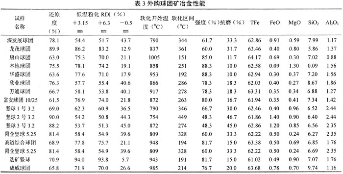 从球团矿的冶金性能指标可看出:自产球团的转鼓强度、低温粉化指数较高,还原度指数较低,而荷重软化温度区问较窄;外购球团的还原度指数虽然较高,但强度与低温粉化指数均较低,荷重软化温度区间宽,会直接影响炼铁生产。