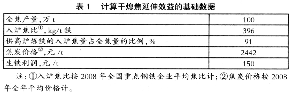 与湿熄焦相比,干熄焦炭的质量高,可使高炉炼铁的入炉焦比下降2.5%;同时高炉的生产能力可提高1%。表1为计算干熄焦延伸效益的基础数据。