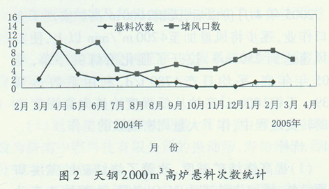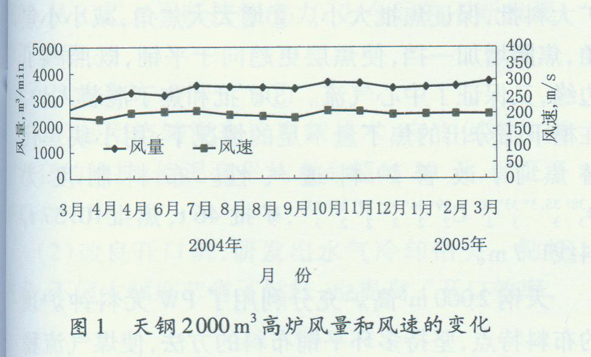 天钢2000 m3高炉开炉初期,一直处于低强度冶炼状态,慢风时间长达1年左右。天钢炼铁厂工作者克服困难,保证了高炉的稳定顺行。