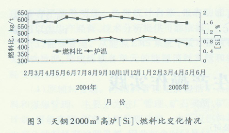 高炉是一个内部高温的反应容器,热量收支的平衡稳定是炉况顺行的保证。天钢2000m3高炉开炉初期,面对风量低、高炉热量收入明显不足的状况,采取了保持高燃料比的方法,使铁水热量充足,保证了高炉的顺行(如图3所示)。