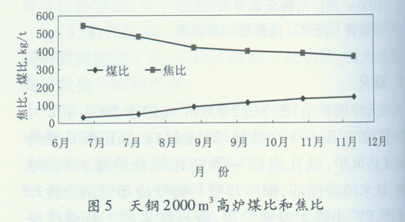 O 3 3 3 2 C 2 2 2 2 2,矿批39 t,焦批13.2t,料线1.5 m。2005年7月,高炉开始喷吹煤粉,9月,开始富氧鼓风。在这一阶段,天钢2000m3高炉全面提高了强化冶炼的进程,在不断提高煤比、降低焦比的同时,为了稳定炉内煤气流,采用了扩大料批保证焦层厚度的方法。随着煤比的提高,炉腹煤气量增加,鼓风动能也相应提高,中心煤气流得到了保证。为防止边缘煤气流自动加重,采用了适当发展边缘的布料制度:①在不断降低焦比的同时,为了保证炉内焦层厚度,以稳定炉内煤气流分布,适当扩大料批,保证焦批大小。②增大大焦角,减小小焦角,焦圈增加一挡,使焦层更趋向于平铺,既照顾了边缘,又保证了中心气流。③矿批和焦丁混装入炉,在槽下筛分出的焦丁量不足的情况下,用小块焦代替焦丁,改善炉料透气性。布料制度为