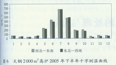 天钢2000m3高炉充分利用了PW无料钟炉顶的布料特点,坚持多环平铺布料的方法,使煤气流稳定提高了煤气利用率,为高炉强化冶炼创造了条件(2005年下半年十字测温曲线如图6所示)。