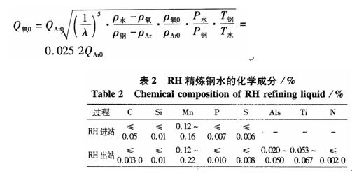 以钢厂250t RH真空精炼装置为原型,原型与模型的几何相似比λ为1:4,RH原型设备中钢水成分如表2所示。实验中采用向水中吹入氧气的方法来模拟现场的氩气吹入,无论在实验中向水中吹入氧气,还是实际生产中向钢液中吹入氩气,均属气一液两相流动[7]。因此可用修正的佛鲁德准数相等来换算实验中的实际驱动气体流量。模型中的标准气量和实际标准气量之间的关系式为: