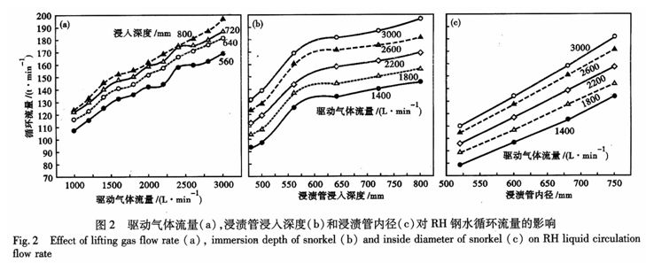 图2(c)表明在不同驱动气体流量时,循环流量随浸渍管内径增大显著增加。在较小浸渍管内径条件下,增加吹入气体量来提高RH的循环流量相对困难。根据气泡泵的原理,当RH真空槽内的真空度控制在某一定值时,钢水在真空室内上升的高度是一致的,与浸渍管内径无关,因此,浸渍管直径大的被真空抽吸上来的钢水量就比浸渍管内径小的所抽吸的钢水量多。采用同样流量的驱动气体所能带动的钢水量就增加了,钢水环流量提高了,同时管径大环流面积大,环流受到管子形状、涡流等影响小,分散的气泡群有可能获得足够的抽吸力,有利于循环流量的提高。