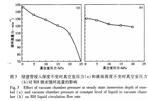 (4)当250t精炼装置的浸入深度600mm到650mm,驱动气体流量2600L/min,真空室压力100Pa,循环流量达到170t/min到180 t/min时,设备生产率显著提高。