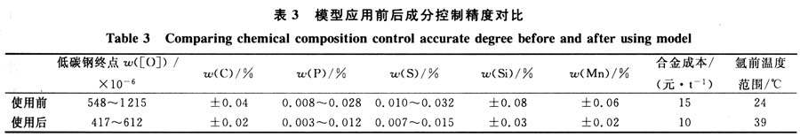 应用转炉烟气分析动态控制系统,准确预报钢水终点碳和温度值及磷硫符合要求,确保转炉终点命中率,实现不倒炉直接出钢模式,使得钢水终点氧含量不仅低而且稳定在很窄的范围内,通过实测557炉定氧数据,终点钢水氧质量分数波动在427~678×10-6;可实现模型准确计算合金收得率,并且根据钢水成分范围和合金价格选择最经济、最合理的脱氧合金化模式,既提高钢水质量,又降低了消耗,并对钢水中P、S变化趋势进行储存预报控制,模型还考虑到Al、Si、Mn氧化及钢包本身周转次数,烘烤情况对温度的影响,可确保成分和氩前温度稳定,钢种的内控达标率由原84%提高到96%以上。模型应用前后成分控制精度对比见表3。
