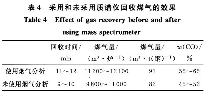 由于烟气分析采样点位于转炉尾部烟道顶部,在烟气冷却和除尘系统的前面,根据质谱仪连续快速分析烟气成分<1.5 s周期特点,其一可使操作人员提前20 s获悉炉气信息,及时回收煤气,同样在吹炼末期将停止回收时间延后,可增加煤气回收时间1 min左右,实现每炉煤气回收时间累计延长1~2 min。其二,利用质谱仪分析ω(CO)来作为调节活动烟罩的升降,以控制从炉口吸人的空气量,提高ω(CO)浓度,提前满足回收条件和延迟回收时间。第三,由于可以从烟气分析掌握炉内冶炼反应状况,操作人员无需看火判断估计,最终实现全降罩封闭操作,对煤气回收、风机寿命和除尘效果极为有利。采用和未采用质谱仪回收煤气的效果见表4。