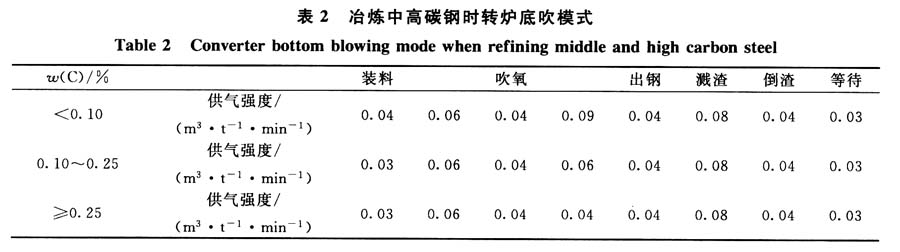 如何确保良好的底吹搅拌效果,马钢在120 t转炉上采取了以下主要措施:①使用了钢研院提供的双环缝式底枪,每座转炉安装6根底枪;②在底吹管路系统专门设计了一套返吹系统,一旦底吹变差,可采用空气返吹;③对不同钢种采取了不同地底吹供气制度(表2);④在吹炼和溅渣过程,适当控制ω(MgO)在8%~10%,严格控制炉底上涨高度在新炉底±200 mm以内,一旦上涨及时采取洗炉底等措施。现转炉在冶炼低碳、超低碳钢种时出钢终点碳小于0.025%以下达到93%以上。