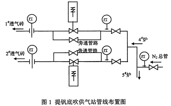 为防止误操作造成断气堵枪,在调节阀前后用旁通管路小气量供气,即使在调节阀全部关闭的情况下,也可保证底枪不堵,复吹供气站管线布置见图1。