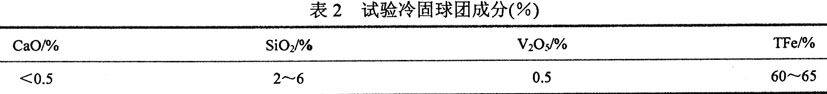 试验用冷却剂为冷固球团、含钒生铁块、冷固球团成分如表2所示。生铁块加入量按10~20kg/吨铁控制,冷固球团加入量按28~35kg/吨电铁控制,可根据铁水温度及含Si量适当调整。