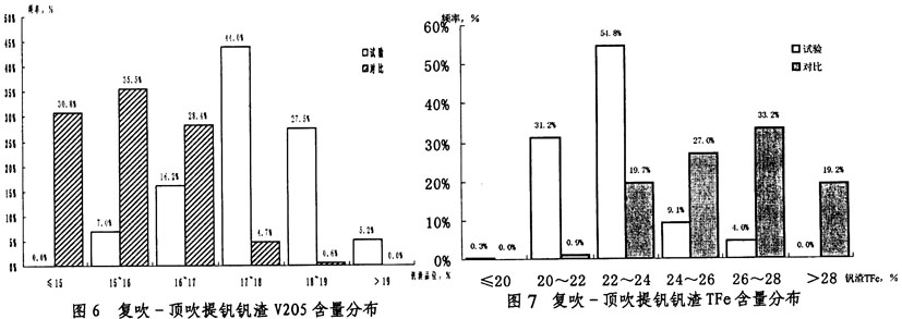 由图6、图7可知,复吹炉次钒渣中TFe含量≥24%的比例为13.7%,比对比炉次的79.4%减少65.7个百分点,钒渣TFe含量在20~22%区间的比例为31。4%,22~24%区间的比例为54.8%,同比增加了30.2和35.2个百分点;在铁水条件相当的情况下,试验炉次钒渣V2O5含量的分布也发生了显著变化,钒渣V2O5%兰16%的比例达到93%,同比增加59.3个百分点,特别是试验期间钒渣V205%≤15%的比例为0%,同比下降30.8个百分点。