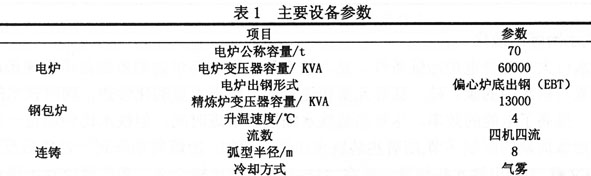 八钢电炉厂主要由一座70t超高功率直流电弧炉,一座70tLF钢包精炼炉,一台四机四流R8m小方坯连铸机组成,其主要设备参数见表l