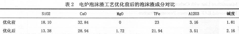 八钢电炉在全废钢冶炼时,主要进行了配料工艺优化,强化吹氧工艺,改进泡沫渣冶炼工艺,实现熔清期、氧化期过程泡沫渣冶炼工艺。①配料工艺:优化前,主要采取电炉配加焦碳600-800kg/炉或配加10%.20%生铁,由于配碳量较低,常常出现泡沫渣难造,过吹等现象,优化后将生铁配入量增加到20%-30%,同时在第二批料中配加一定量的焦碳,这样既可以保证炉料足够的配碳量,又可以保证熔池形成后泡沫渣迅速形成。②吹氧强度优化:优化前主要采取0.95 m3/t.min供氧强度,优化后制定出不同冶炼时理的供氧强度,熔化期吹氧的主要作用为切割废钢和元素氧化,采取送电5min以后吹氧,供氧强度选择1 rn3/t·min,氧枪插入熔池中以提高熔化期氧气利用率。在氧化期以吹氧脱碳为主,熔池温度迅速升高。操作上一方面提高供氧强度,达到脱碳的目的,另一方面控制好炉门流渣量,达到脱磷的目的。此时选择供氧强度为1.1 m3/t.min。③熔清期、氧化期过程泡沫渣冶炼工艺:泡沫渣的好坏是决定电能利用的关键,在全废钢冶炼时,由于入炉废钢大部分为轻薄料,使炉渣中(FeO)含量较高及炉渣碱度下降,造成熔渣的表面张力降低,炉渣变稀,熔渣的发泡能力减弱,埋弧困难。通过改善炉渣的成分,合理喷碳操作,并适合提高炉渣碱度和炉渣中MgO的含量,使炉渣发泡性能改善,达到电炉高档送电的埋弧效果,电炉泡沫渣工艺优化前后的泡沫渣成分对比见表2