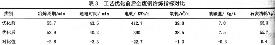 八钢电炉厂通过上述工艺优化,同时有效控制非生产时间,大大降低电炉冶炼周期,电炉冶炼周期下降2.8分钟,由于冶炼时间缩短,电炉吹氧量、喷吹碳份等其它技术指标也明显下降,具体见表3