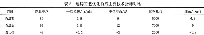 2004年以前连铸二冷存在的主要问题是:二冷段水汽冷却强度不够、冷却效果不均匀、二冷喷嘴经常堵塞影响出水量等造成连铸坯经常出现脱方、缩孔等质量缺陷,连铸拉速较低影响到产能的发挥,通过二冷改造将一段的冷却长度增加,每根竖管的喷嘴数由原来的五个改为九个,从而增加了冷却强度,比给水量控制0.6-0.8。二冷二段竖管由原来两点固定改为现在的三点固定,将二段竖管的长期高温下使用的形变降到最低限度,确保铸坯各个面冷却程度均匀,并将冷却水、气路合理分布,改善冷却水质,大大降低喷嘴堵塞的情况。严格控制结晶器装配质量,固化结晶器使用寿命,提高结晶器水量到110一120m3/h,保证了实现高拉速的前提、合理控制工序时间和温度,实现低温快注,其效果见表5。