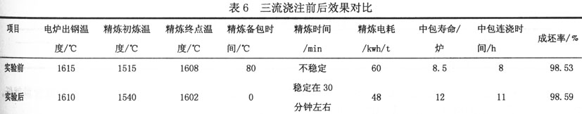由于电炉兑加铁水量不稳定,电炉兑加铁水10-20%时冶炼周期为42.45分钟,而全废钢时冶炼周期为52-56分钟,造成生产节奏的不稳定,有时为保证连浇,精炼炉备包时间延长,并要对精炼出钢温度频繁调整。为保证电炉整个流程稳定,通过对电炉、精炼、装包、连铸等工序大量生产实践,决定将原有的四个钢包运转改为三钢包周转,加强钢包烘烤制度,出钢时钢包温度要求大于l100℃:连铸改四流开机为三流开机根据电炉节奏决定第四流开出时间;减少精炼炉备包时间,具体效果见表6