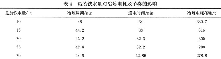 电炉热装铁水可大大改善电炉冶炼条件。兑入铁水后,铁水与炉内的留钢留渣迅速形成溶池,这时炉门氧枪吹入的氧与铁水中的碳、硅、锰等元素快速反应,放出大量的化学热,同时铁水的兑入使泡沫渣的形成时间提前,提高了电能的效率。尽管热装铁水缩短了冶炼时间,但铁水比例超过一定临界值后,水脱碳成为缩短冶炼周期的限制环节,随着热装铁水比例的增加,冶炼周期降到一定值后反而增加,吨钢耗也稍有上升。【文献2】指出铁水热装量一般在25~40%之间比较合适,我厂通过对电炉兑铁水实践,出铁水热装量在30~35%,冶炼电耗最低、冶炼周期最短。兑加热装铁水量的不同对冶炼电耗及节奏的影响见表4
