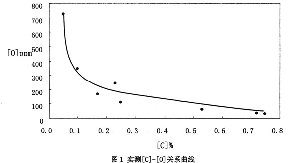 电炉出钢终点碳的控制又是决定电炉钢水质量的关键,通过C-O平衡分析,钢水碳含量的降低通常会造成钢中氧含量成倍增长,自用电炉实测碳-氧关系曲线图可根据终点[C]含量精确控制电炉出钢脱氧剂加入量,电炉实测碳-氧关系曲线见图1