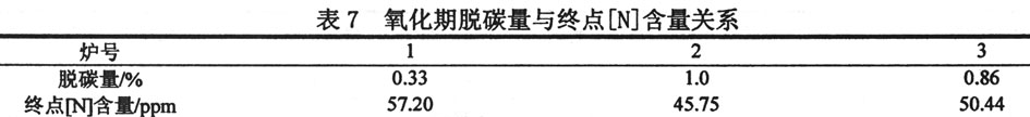 从表7中的数据可以反映出如下关系:氧化过程中碳含量高,到达冶炼终点时,钢液中氮含量就低.因此,保证氧化期的脱碳量在0.8-1.0%,可使冶炼终点氮含量保持在50ppm以下。