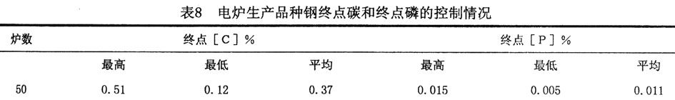 八钢电炉厂在生产品种钢保证配碳量在1.2一1.4%,以便于电炉采取高拉碳的冶炼工艺,通过电炉氧化期C—O反应生成的大量C0气体将钢中的夹杂物和气体排出钢液。但同时要注意脱碳与脱磷的关系,氧化别增大供氧强度加速脱C,并适当补加石灰,避免因为采取“留碳操作”造成的渣中FeO含量低,影响炉渣的脱磷效果,电炉终点[P]可控制在0.015%以下。八钢电炉厂在生产品种钢时电炉终点碳和终点磷的控制制况见表8。