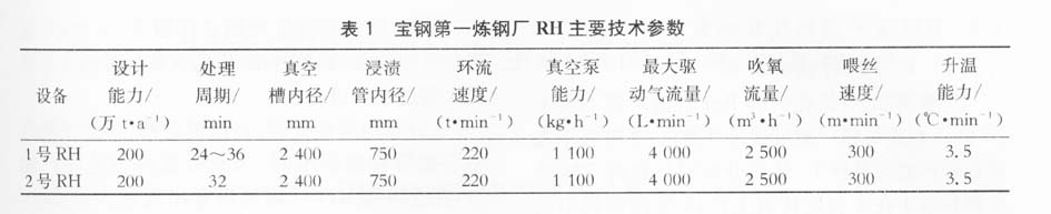 宝钢一炼钢主要生产设备包括3座300 t转炉、2台板坯连铸机、1台厚板坯连铸机、2台RH、1台LF、2台CAS、1台KIP以及模铸设施。RH处理的钢种主要有超低碳钢、管线钢、厚板钢、锅炉钢、模具钢等,RH的主要参数见表1。