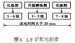 根据九级无载调压每级运行时的升温情况,结合现场的实际操作, 决定采用 3~ 5 级进行升温( 为确保变压器的用电安全和延长变压器使用寿 命一般不使用 1~ 2 级送电) , 升温速率可达 215~ 315 ℃?m in , 而化渣采用 5~ 6 级则电极工作较 为平稳, 化渣快, 如用 3~ 4 级化渣电极工作稳定性差, 7~ 8 级化渣电极工作虽平稳但化渣较慢,采 用 7~ 8 级工作时, 钢水升温速率< 015℃/m in。根据上述情况选择了如下配电制度, 见图 1。