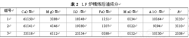 表 2 为L F 炉精炼后的渣成分, 从表 2 所示