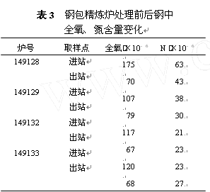 从表 3 中可看出, 经L F 炉处理后钢中全氧 含量降低了 40%~ 60% , 钢中氮含量有所增加,基本在正常范围。