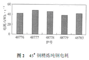 改造后的L F 精炼炉工艺基本满足现有的冶 炼工艺, 满足 8 流连铸机的生产, 目前已实现 17炉 连浇, 生产了 70G、 ER 70S - 6、 45 碳结圆、SW R CH 35K、20g、82B 等钢种, 冶炼电耗达到设 计值。 图 2 为 45# 钢的精炼电耗值, 平均为 42kW h ?t。