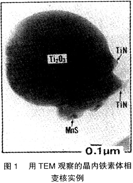 图1表示晶内铁素体(下称F)的相变核,即在Ti系氧化物中析出了MnS和TiN。图2中所示相变核由Ti-Mn氧化物、MnS、TiN组成。Ti-Mn氧化物不但成了MnS和TiN的核出核,而且能抑制F从晶界析出。MnS降低了Ar3相变点。因其共格性,TiN使生成F变得容易了。