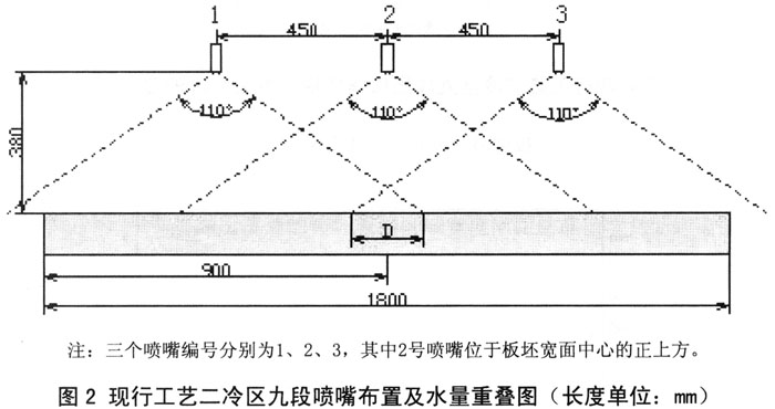 从图2中可以看出,在喷嘴之间的间距均为450mm,距铸坯表面的距离均为380mm,且喷嘴的喷射角为110°时,三个喷嘴的喷淋覆盖面积达到了1985mm,大大超过了铸坯的宽度1800mm,另外,由于单个喷嘴的喷射范围大,板坯宽面中心处出现了三个喷嘴水量相互冲击叠加的区域,叠加区域宽度D为189彻。